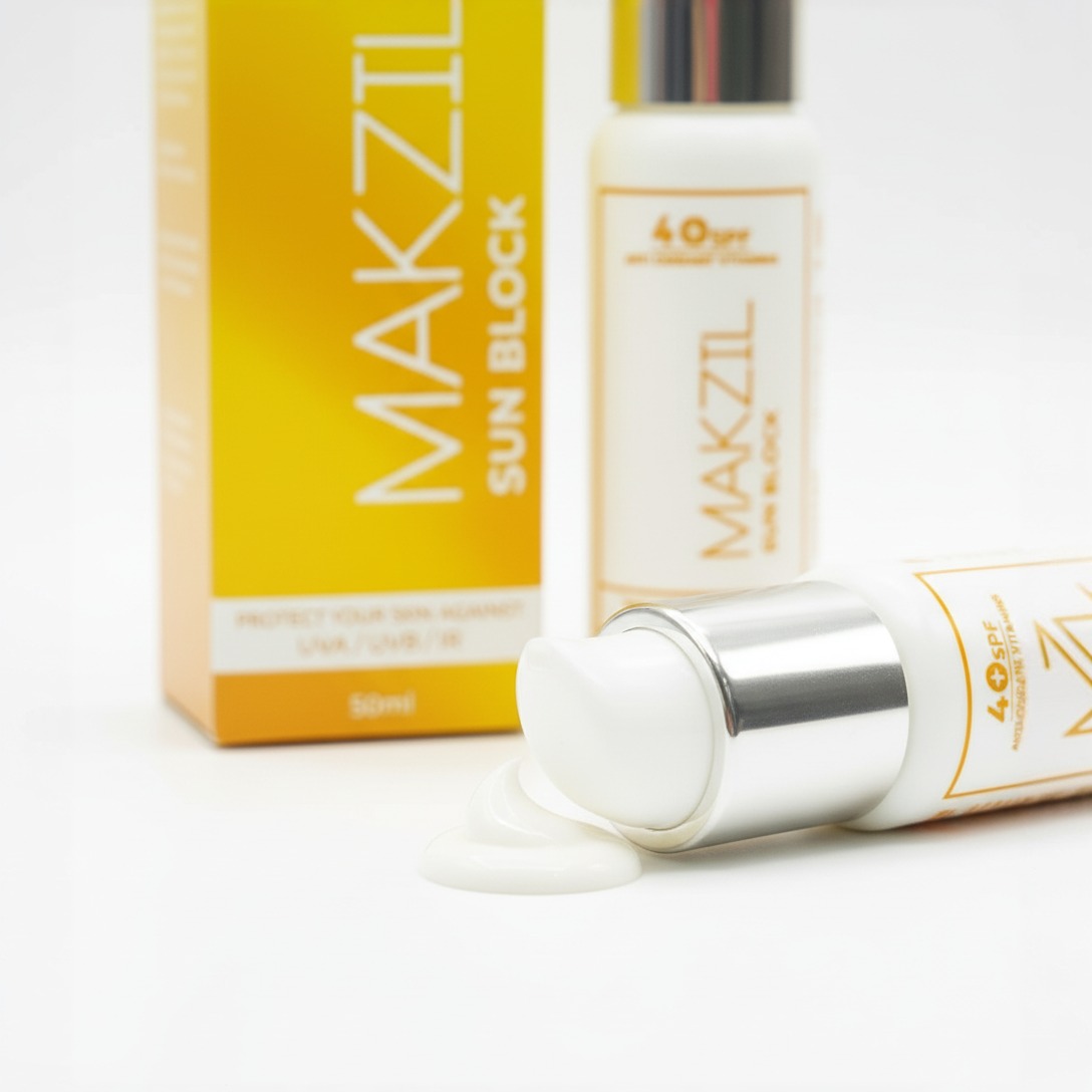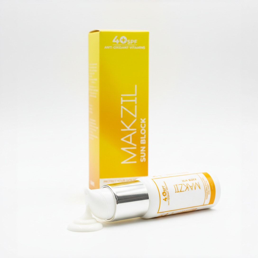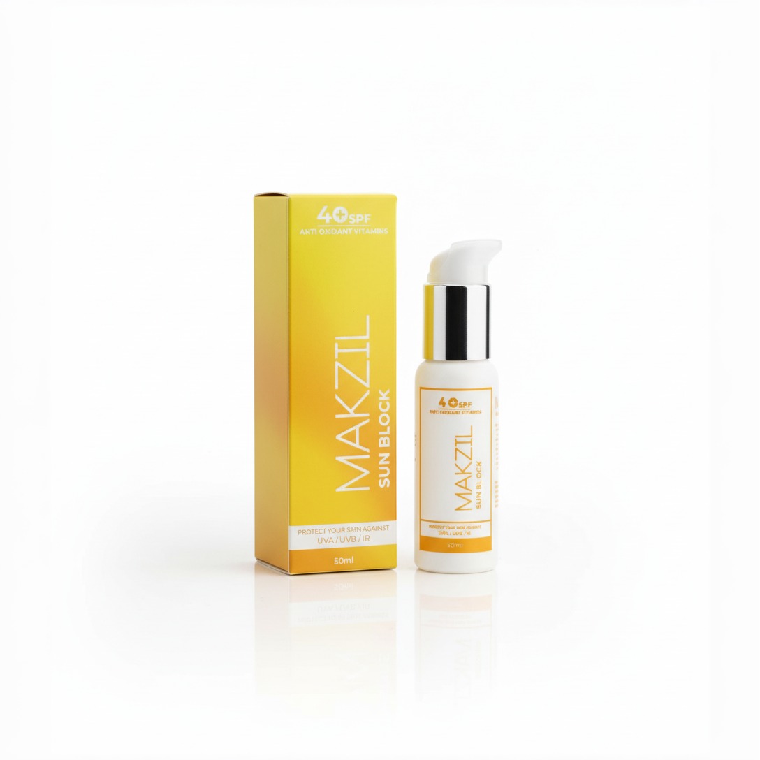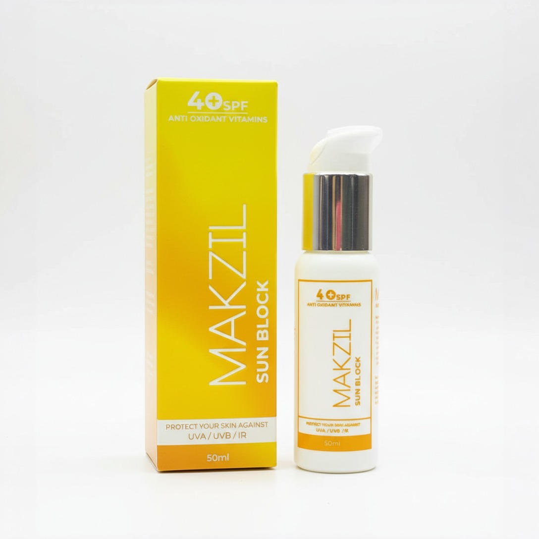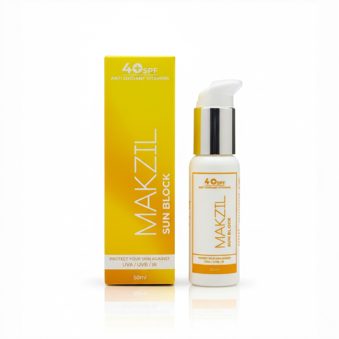Makzil Sun Block is a broad-spectrum sunscreen that shields your skin from harmful UVA and UVB rays. Its lightweight, non-greasy formula combines physical and chemical UV filters with Aloe Vera to provide maximum protection while keeping your skin cool, fresh, and hydrated. Perfect for daily use, even under makeup.